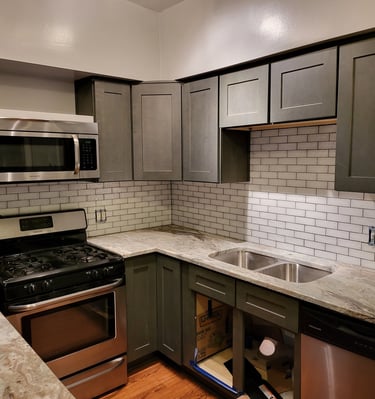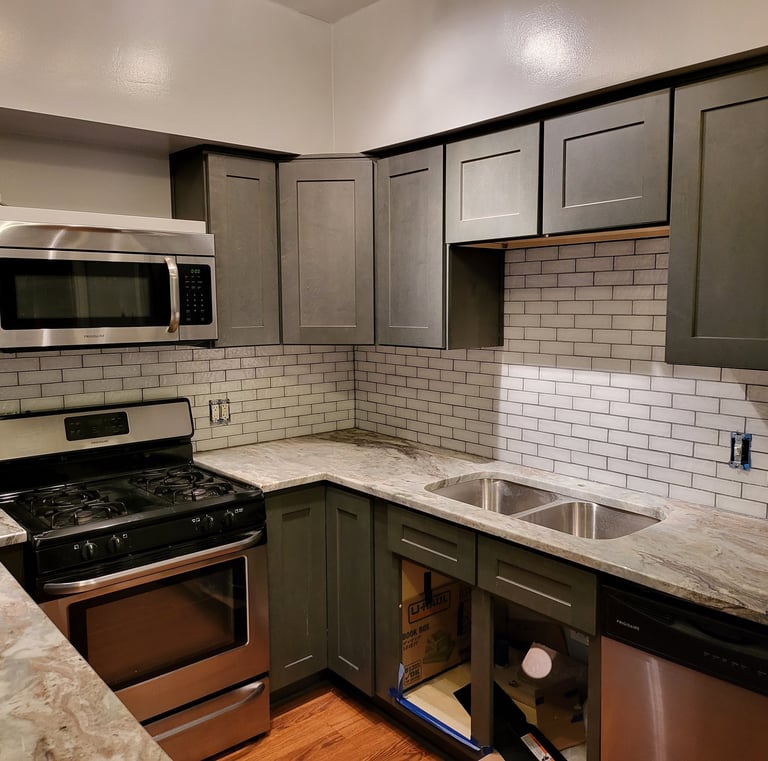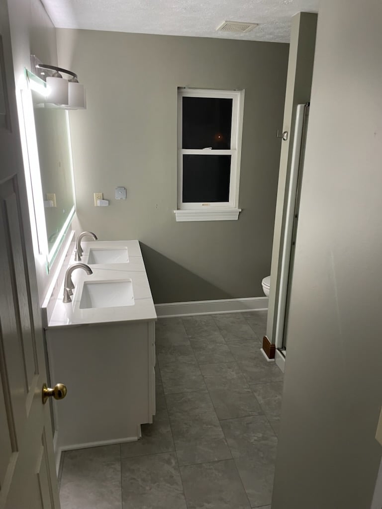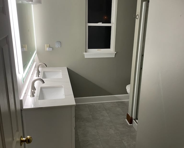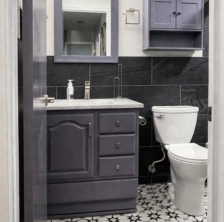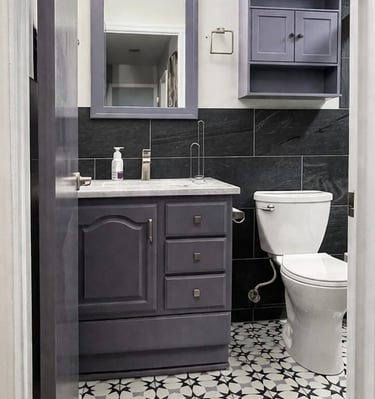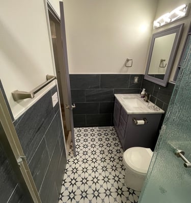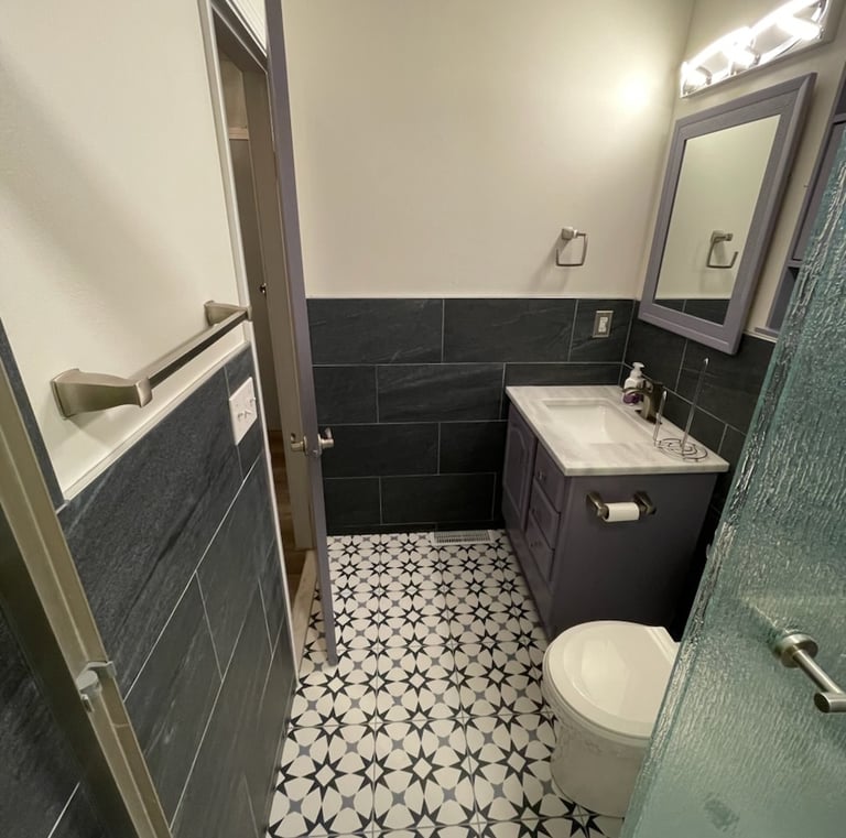 A complete bathroom makeover with elegant tile patterns that brighten the space.
